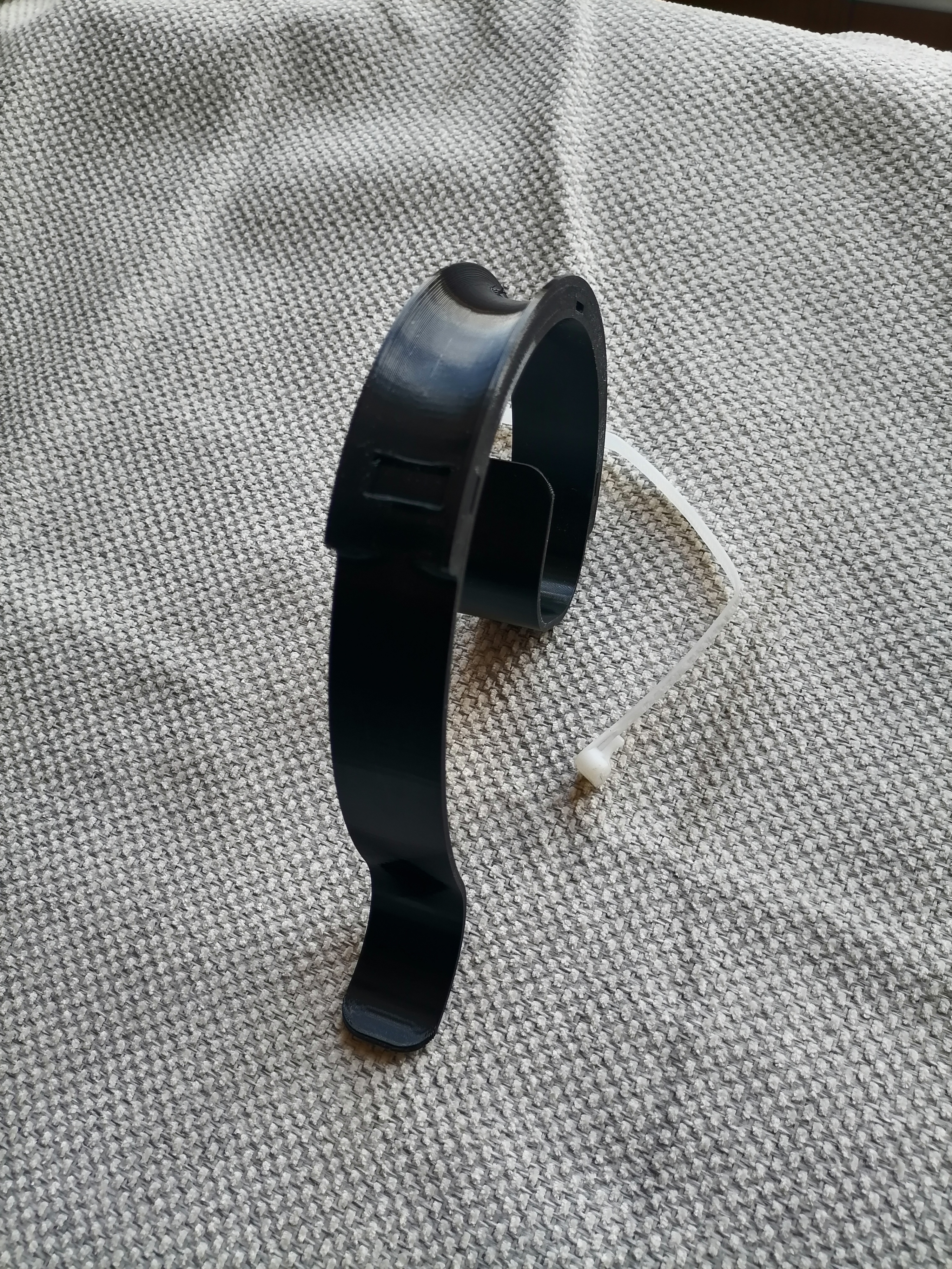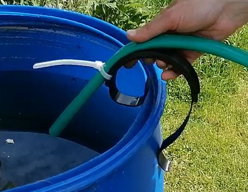 Универсальность конструкции позволяет при необходимости мгновенно снять держатель с бортика бочки или установить его туда или передвинуть вдоль бортика. При этом не требуется осуществлять каких-либо дополнительных действий по фиксации держателя на бортике. А шланг удерживается на бортике устойчиво и не соскальзывает при изменении напора (струи) из шланга. Фиксация шланга в держателе осуществляется нейлоновой многоразовой стяжкой, продетой в специальные проушины в держателе. При необходимости можно отрегулировать нужное усилие фиксации шланга в держателе путем утягивания или ослабления петли стяжки. В держателе предусмотрено 3 места для установки фиксатора шланга (нейлоновой стяжки). Благодаря этому можно выбирать под текущие нужды нужное расположение фиксации шланга на дуге держателя. По желанию можно зафиксировать шланг в держателе сразу тремя фиксаторами.