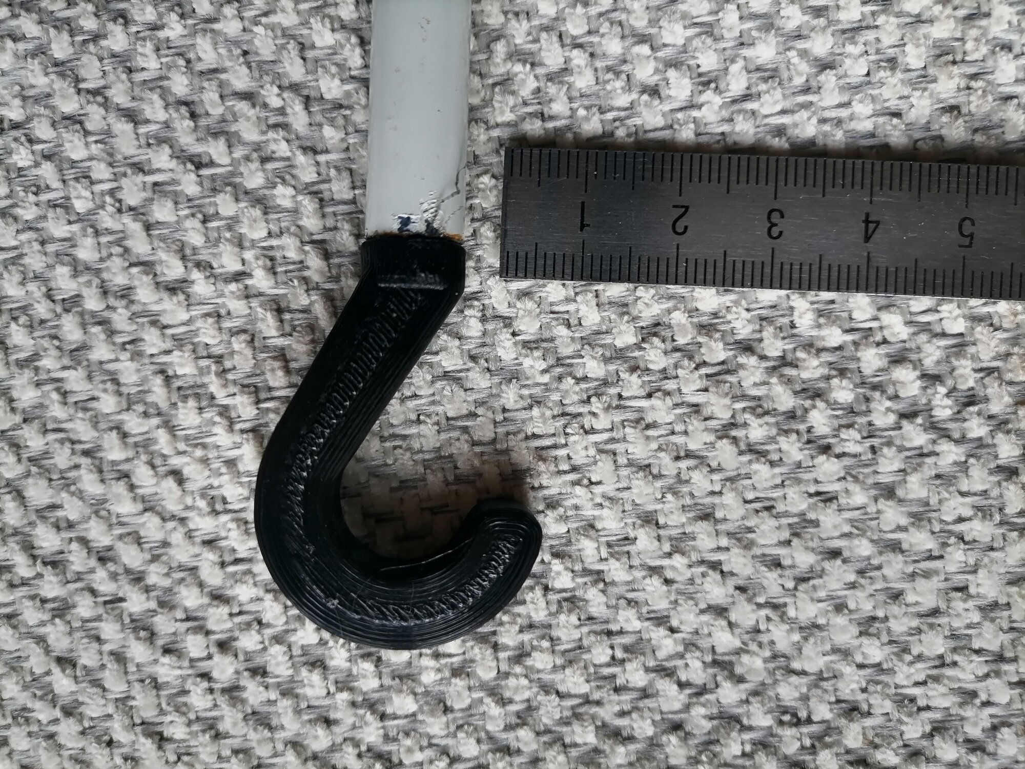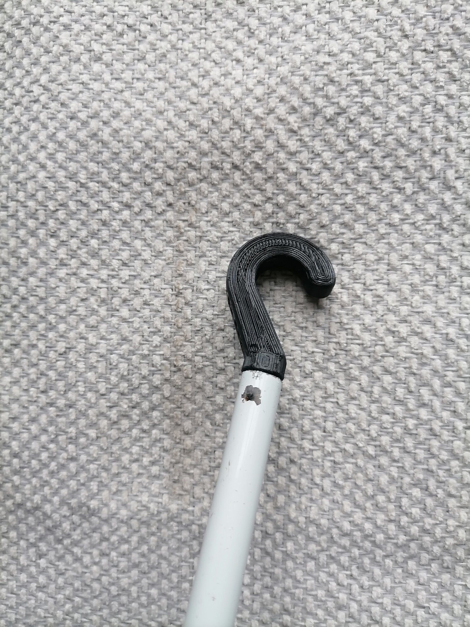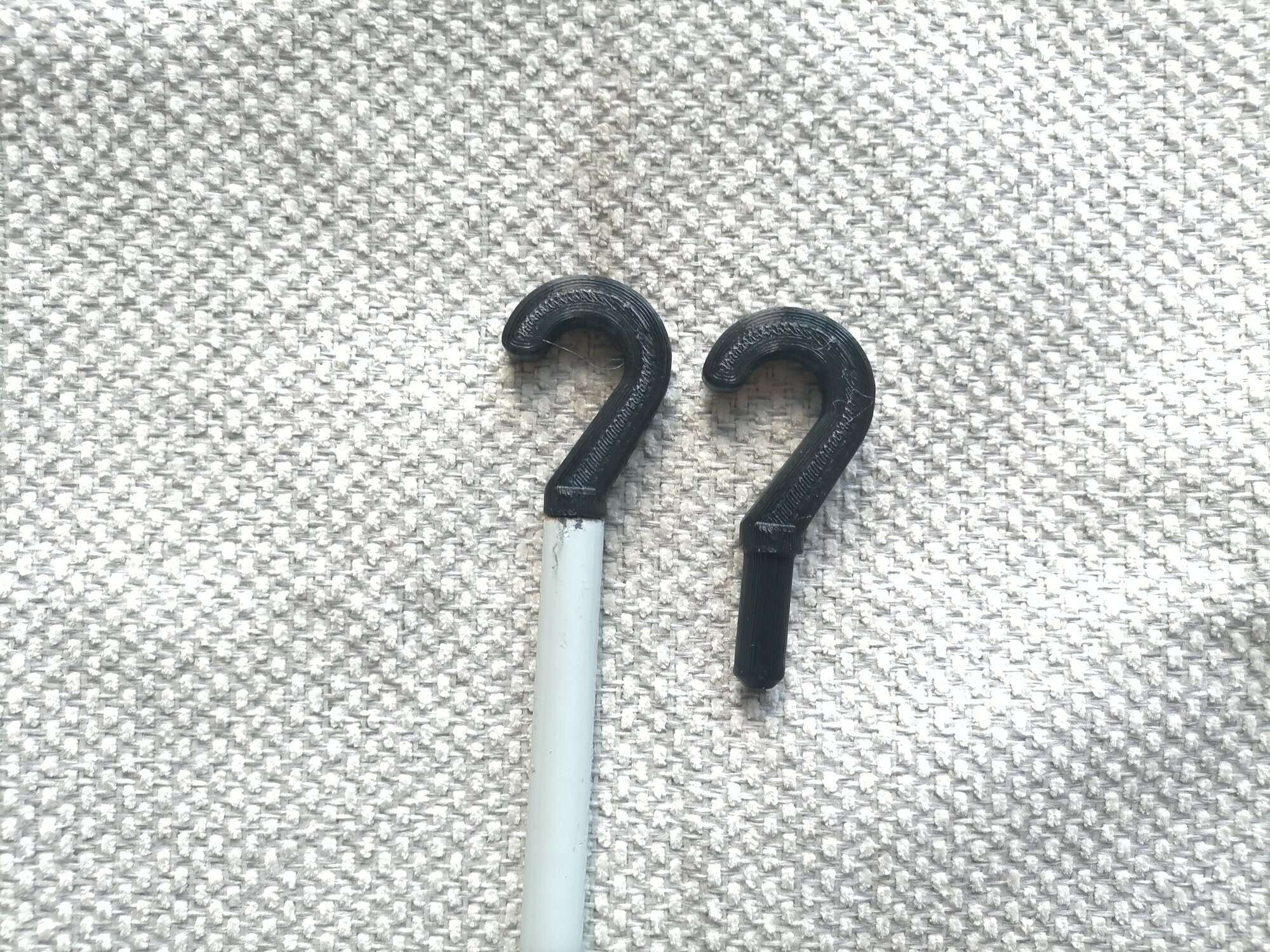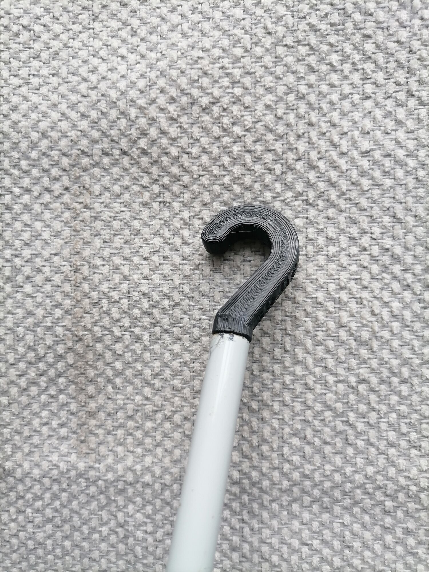 Для сборки с трубкой нужно вставить крючок тонкой цилиндрической частью во внутреннее отверстие штатной трубки ("палки") и постукивая по крючку молотком задвинуть крючок в трубку до упора в бортики крючка. Для надежности можно нанести небольшое углубление на боковой поверхности трубки в районе крючка с помощью керна (или толстого гвоздя) и молотком. Изделие готово к эксплуатации.